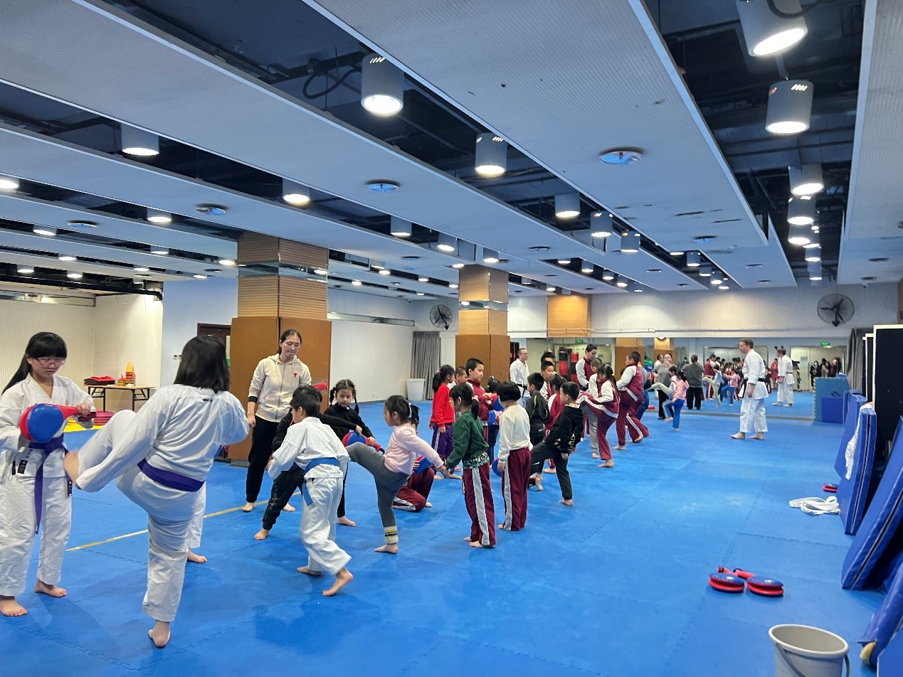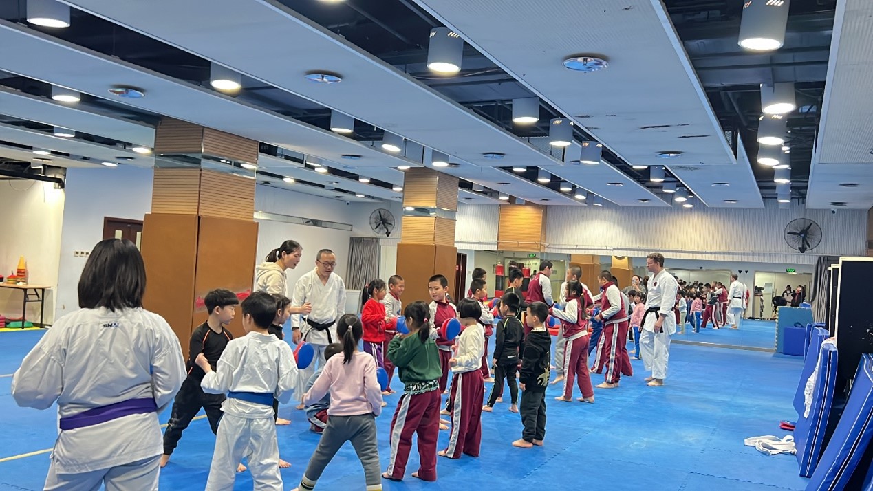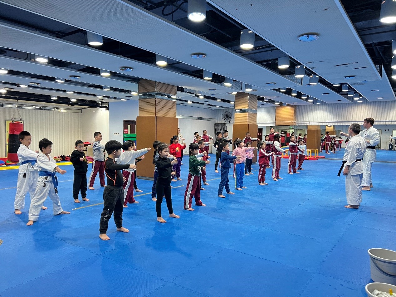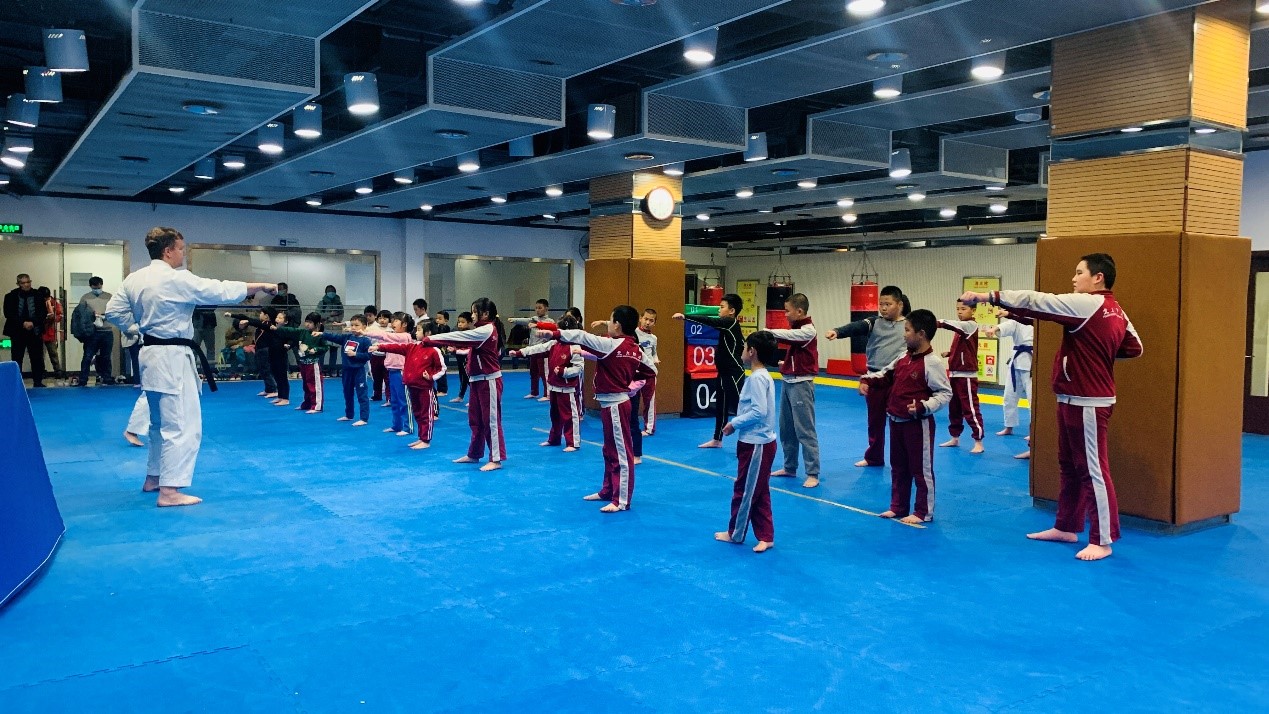 学习了空手道的礼仪后,洪量教练、Bernd助理教练带领孩子们开始热身,充分地活动肩膀、手臂、腿部等部位,避免运动损伤。
