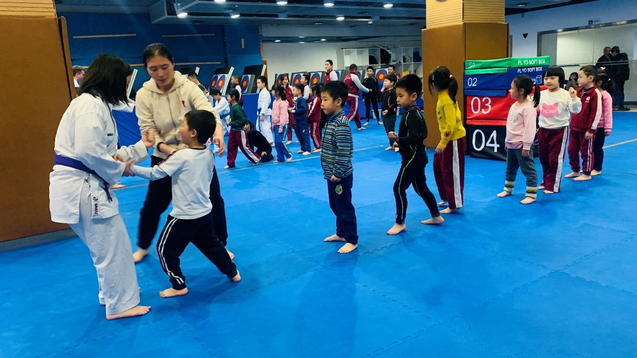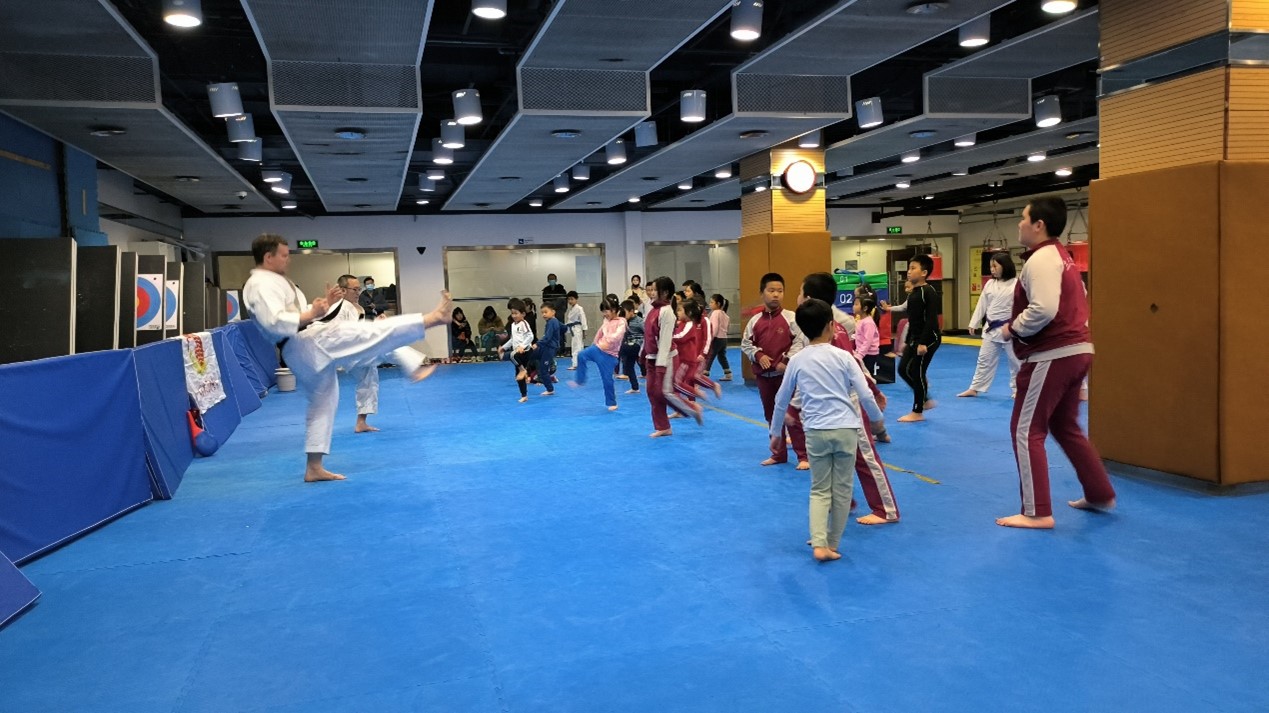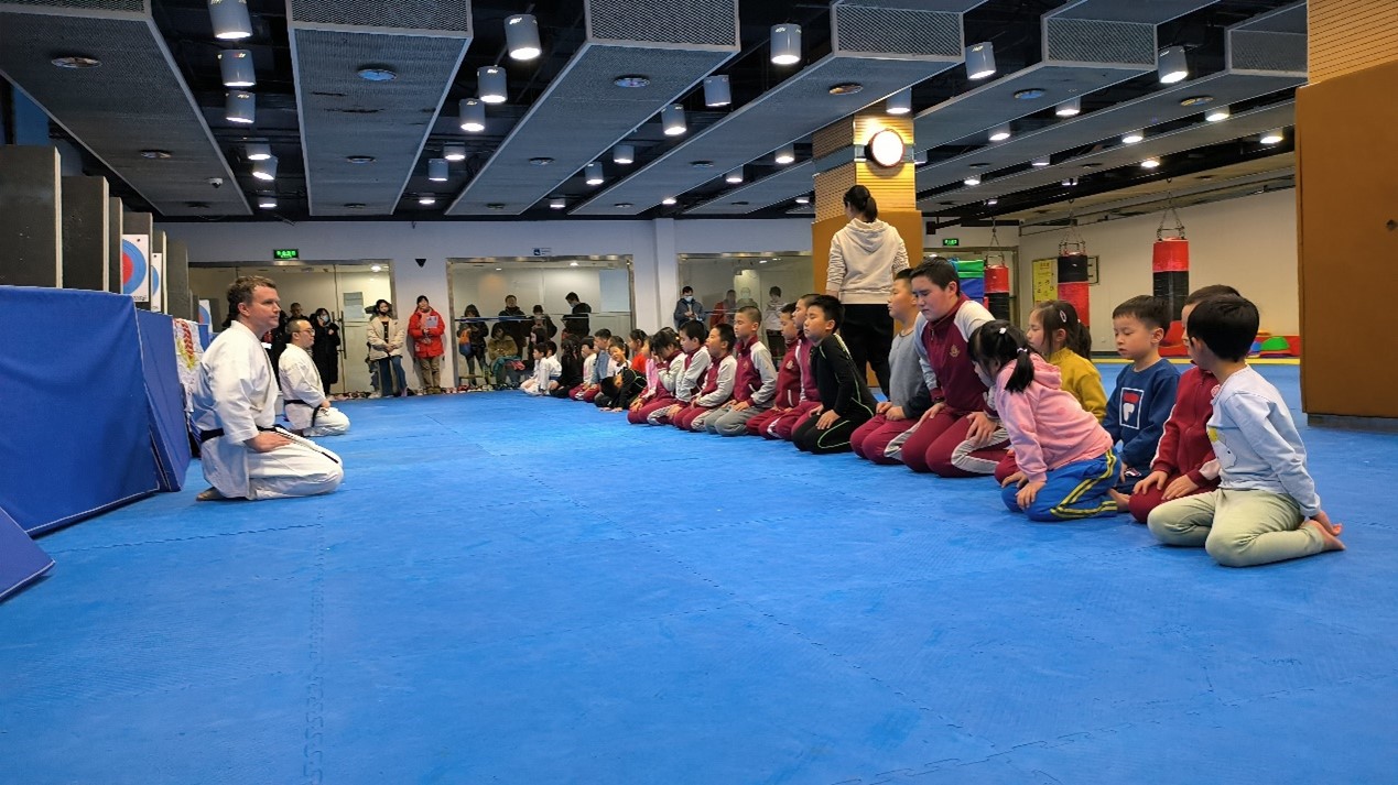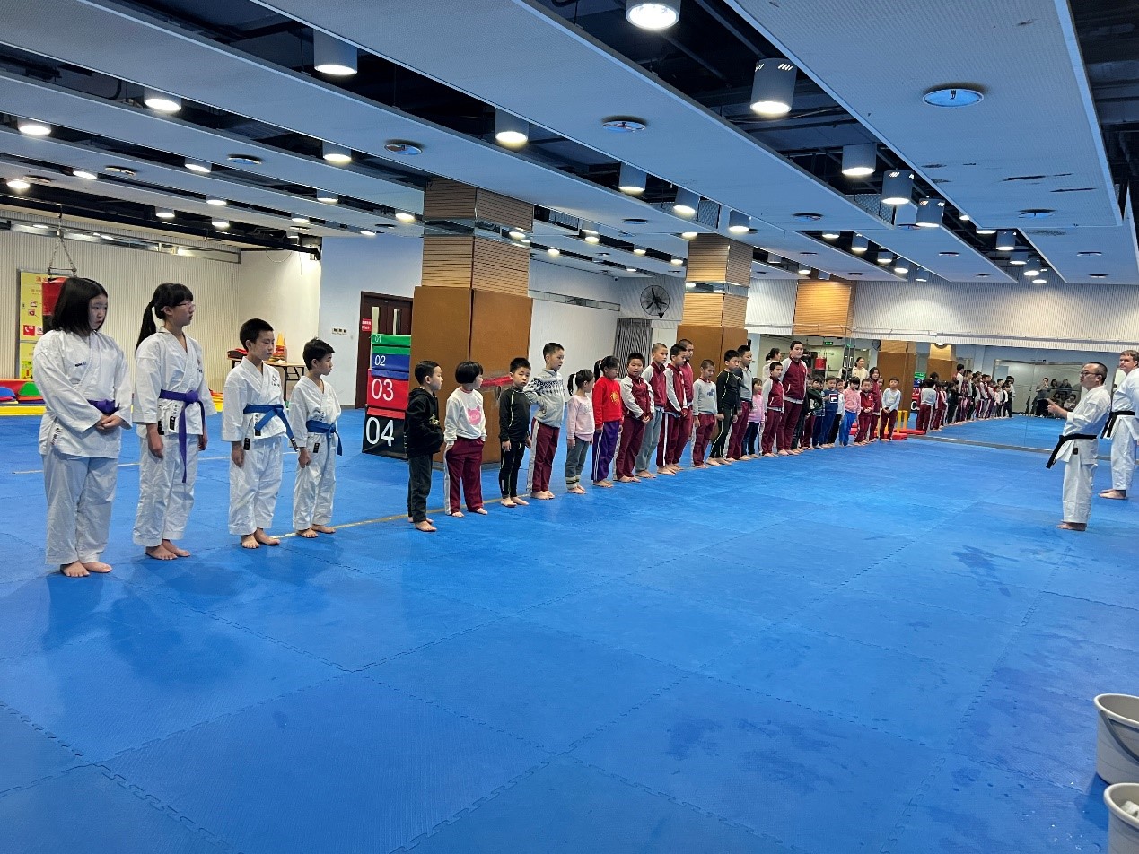 学习了空手道的礼仪后,洪量教练、Bernd助理教练带领孩子们开始热身,充分地活动肩膀、手臂、腿部等部位,避免运动损伤。