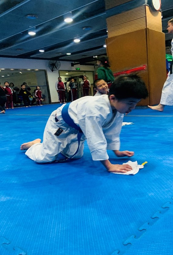 雏鹰社的孩子们此前参加过很多训练营,但是这次却惊奇地发现空手道训练营的与众不同---教练带领大家做的第一项练习是拧抹布擦地垫。洪量教练告诉孩子们每次上课都要自己擦地垫,许多孩子在家做过家务,但是自己拧抹布擦地垫还是第一次,孩子们干劲十足、认真地擦拭地垫。
