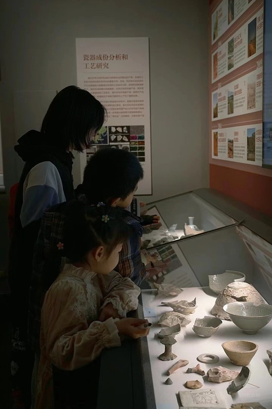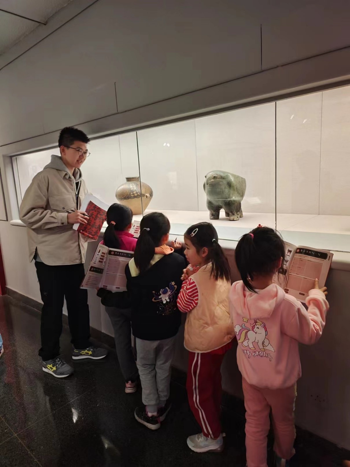 序厅里,迎面看到的就是具有各时代显著特征的重要器物,它们以欢迎的姿态迎接着大家。在大哥哥大姐姐们的悉心讲解下,孩子们看到了与“天子无戏言”的典故息息相关的西周早期叔虞方鼎;有1958年北大考古专业在陕西华县发现的鹰形陶鼎,其憨态可掬的模样让孩子们十分喜爱。