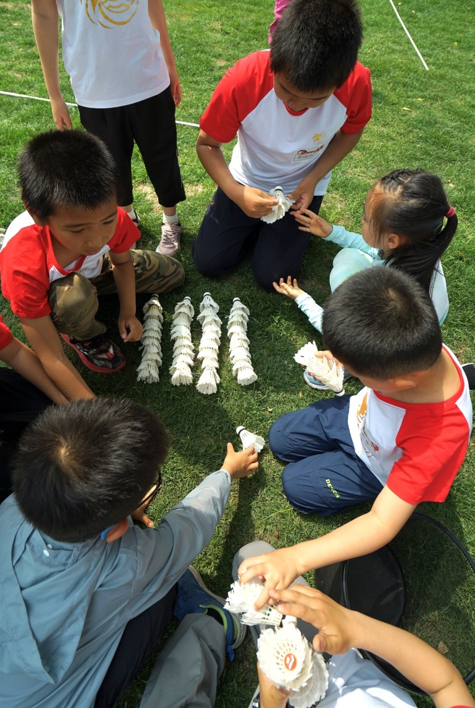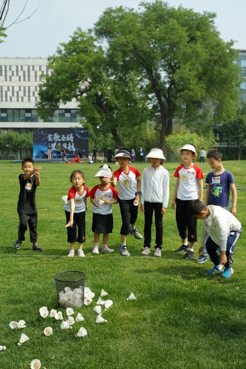 第一二小组比赛的同时,第三组和第四组开展羽毛球投球挑战赛。“团结起来、振兴中华!”“好好学习!天天向上!”小朋友的队呼铿锵有力。草地上用栏杆围成两个正方形,正方形的中心点放置球筐,队员们站在栏杆外向球筐投掷羽毛球,可同时投球,每投进一球计一分;未投进的球可以进到圈内捡出来再投。“捡球!跑出来!”在组长的口令下,组员们动作利落、行动迅速,即使满头大汗也都兴致盎然,为每一分成绩积极争取。