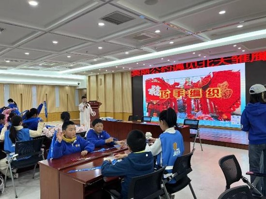 接下来,“美丽公约”宁夏服务站导师、宁夏结绳编织非遗传承人刘银宁老师教习小朋友结绳编织技艺,用彩色的丝线和“美丽公约”蓝丝带编织象征环保契约的“蓝手环”。刘老师教得耐心、小朋友们学得认真,年龄大的哥哥姐姐还主动帮助年龄小的娃娃,不一会儿一件件精美如艺术品的“蓝手环”就在小朋友们的巧手下逐渐成型。
