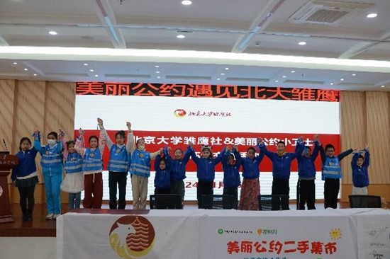 活动进行到这里,不论年龄大小、来自哪里,各民族的小朋友们早已亲密无间、无话不谈,大家互相交换二手闲置礼物,给对方亲手系上象征友谊的蓝丝带,在各自的活动手册上签名留念,并留下联系方式,相约常联系。北大雏鹰社理事长田越老师和“美丽公约”的创始人史宁老师也代表恰好同为十周岁的雏鹰社和“美丽公约”缔结友好同盟,相约未来共同开展环保系列活动。