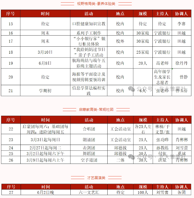 经过与会雏鹰社理事的热烈讨论,2024年度春季学期雏鹰社工作计划安排如下: