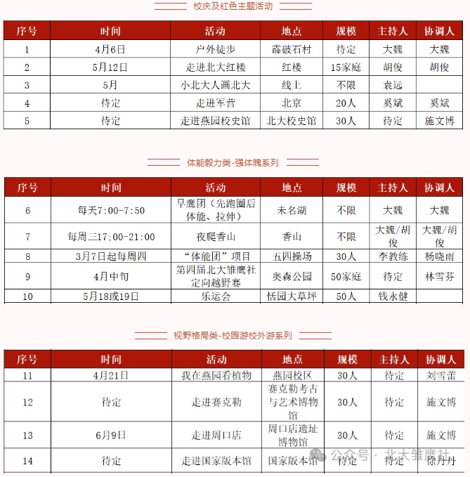 新学期,雏鹰社将继续秉持“我为人人、人人为我”的亲子互助教育理念,以活动为载体,通过锻炼体能毅力、拓展眼界格局、进行启蒙教育、提供文艺展演等形式,助力北大雏鹰五育并举、全面发展,成长为有毅力、有格局、有才华、敢担当、擅融合的雄鹰。
