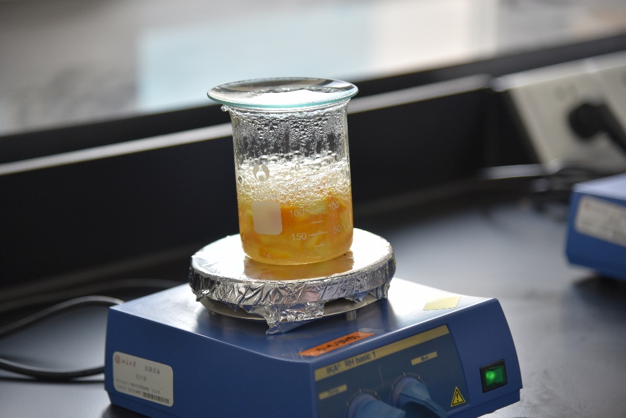 贾老师先耐心讲解了实验原理和步骤,然后让小雏鹰们分组协作。第一步是将切碎的橙子皮放入烧杯,向烧杯中加入去离子水,并通过电磁加热搅拌器控制反应的温度和时间,使我们需要的物质溶解到溶液中。随后进行过滤,把得到的滤液倒入小烧杯中。最紧张的时刻到了,向放有滤液的小烧杯中缓缓加入乙醇,原本透明的溶液中逐渐析出絮状沉淀——果胶。经过溶解、过滤、洗涤、干燥等操作,小雏鹰们成功提取出了果胶,大家都兴奋不已。