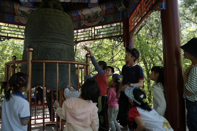 大家踩着未名湖畔斑驳的石板路,攀上小土山,上面坐落着一个小小的六角钟亭。亭内悬挂着青铜大钟,十二对蛟龙戏珠浮雕在春阳下泛着青辉。