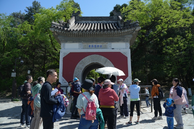 行至湖畔,小伙伴们又一起远眺和珅仿颐和园清晏舫建造的石舫遗迹。拾步向西,始建于清乾隆年间的花神庙,如今仅存朱红山门巍然挺立,门额“重修慈济寺”的斑驳字迹间,映照着百余年前英法联军焚毁圆明园时的血色记忆。