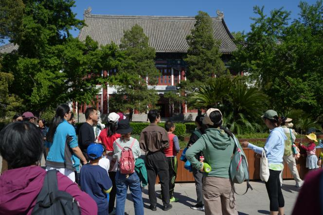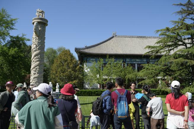 当主讲人讲述安佑宫华表如何在战火中迁存燕园,家长与孩子们共同凝视柱身云龙纹,感受乾隆年间铸造的历史温度。