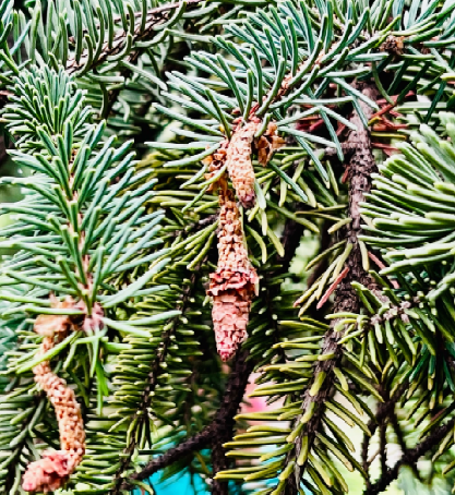 静园东北角,两棵白杄清姿卓然。白杄是松科、云杉属乔木植物,是我国特有树种,雌雄同株。正常情况下,雄球花藏在树冠的中下部,像个低调的小帅哥,成熟后花穗还能摘下来晒成松花粉。而雌球花则高高在上,球状或卵圆形,成熟后就变成了木质化的松果。仿佛是大自然的巧妙安排,让它们各自守护着属于自己的领地。然而,孟老师指引我们仔细观察其中略矮小的那棵白杄,发现了重要的差别!因基因突变,它出现了罕见的雌雄连体现象,即雌球雄球混为一球,近段为雄,远端为雌,这可能是一种植物界的“返祖现象”。是什么样的生存压力,让这株燕园白杄走上了雌雄连体的基因突变之路?