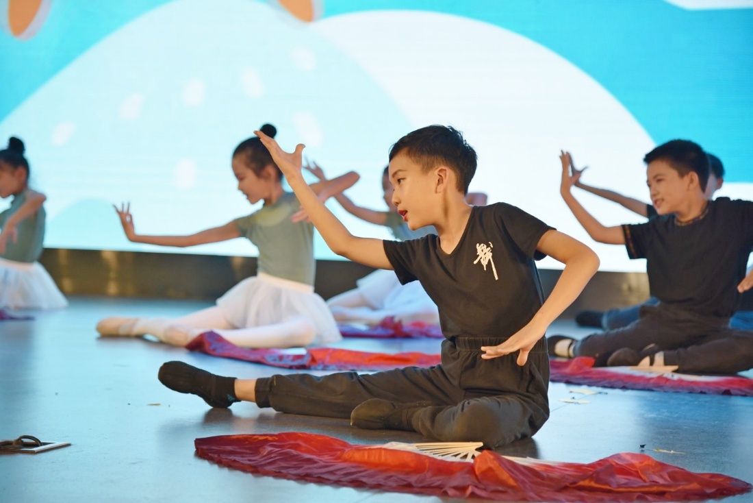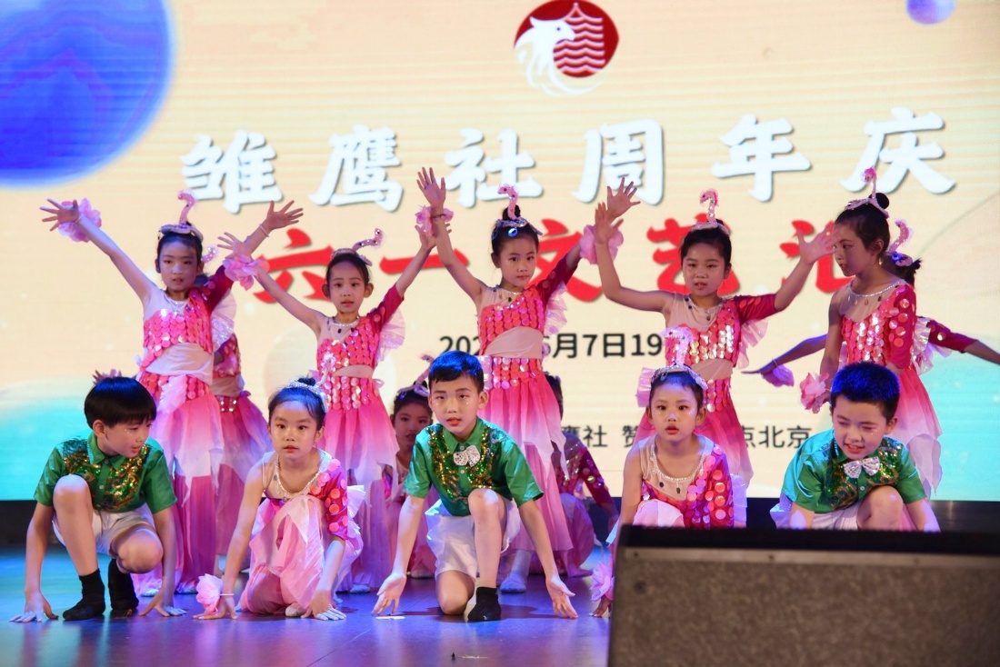雏鹰社舞蹈团的表演贯穿晚会始终。风格多样的舞姿、精致有型的妆造为晚会留下了许多美丽的瞬间。舞蹈团幼儿团的萌娃化身《九州同》的小精灵,用灵动舞姿展现了对祖国壮美山河和各族人民团结和谐的赞美。在舞蹈团幼儿团的另一支舞蹈《鱼儿欢歌》中,孩子们模仿小鱼的动作嬉戏摆尾,活泼俏皮,充满了童趣。舞蹈团启蒙团的小朋友们身着民族服饰,像一朵朵美丽的花儿一样,表演了精彩的舞蹈《古丽》。舞蹈团学龄团的《缅桂花开朵朵香》芬芳满台,颤动的缅桂花映衬着姑娘们青春俏丽的脸庞。群舞《阮郎归·初夏》中,舞蹈团学龄团的孩子们的裙裾翻飞似荷风,带来阵阵初夏的味道。