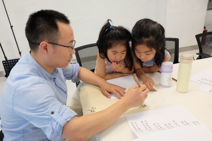 在沈老师的耐心引导与启发下,小朋友们创作热情高涨,纷纷投入自由创作的奇妙之旅。过程中遇到小难题——如笔画的弧度总是掌握不好、字的间架结构看起来不够协调时,他们会向沈老师求助。沈老师随即走到他们身边,仔细查看作品,亲自书写示范,并同时讲解写字的要点,给小朋友们提供直观的临摹范例。