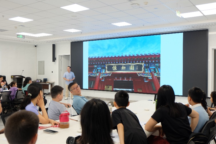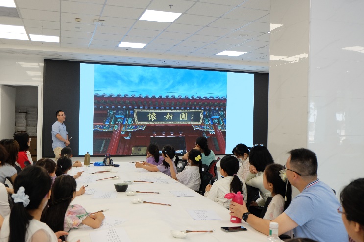 沈老师讲解字体细致入微,从笔画的起笔、行笔到收笔,都清清楚楚。讲到相关北大历史时,他又化身校史研究者,将学校从创立至今的发展历程,像一幅画卷般在小朋友们的面前展开。例如,讲到某块匾额时,他会提到当时的历史背景,是谁题的字,以及这个字在当时所代表的意义。小朋友们听得眼睛发亮,仿佛穿越时空,来到了题字的年代。
