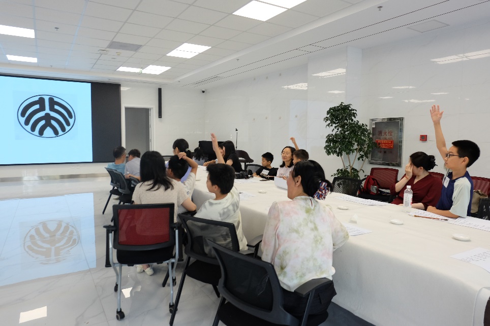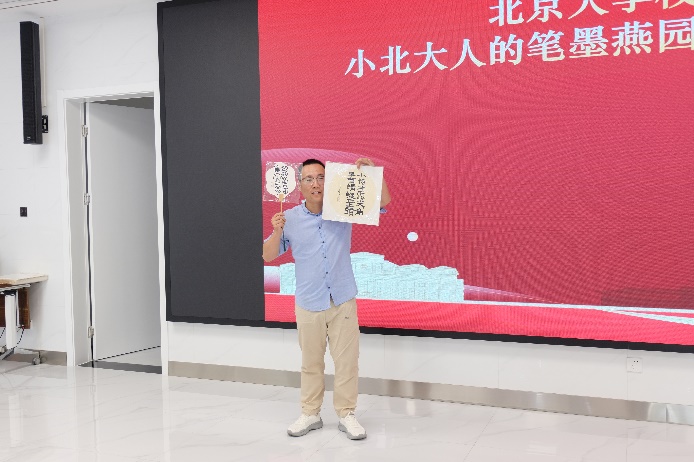 讲课结束后的互动环节,小朋友们个个积极踊跃,都想回答老师的问题。答对的两位小朋友得到了沈老师的书法作品作为奖励,脸上洋溢着自豪和喜悦的笑容。这些奖品不仅是对他们回答正确的奖励,更是对他们勤学书法、探求北大历史精神的一种鼓励。