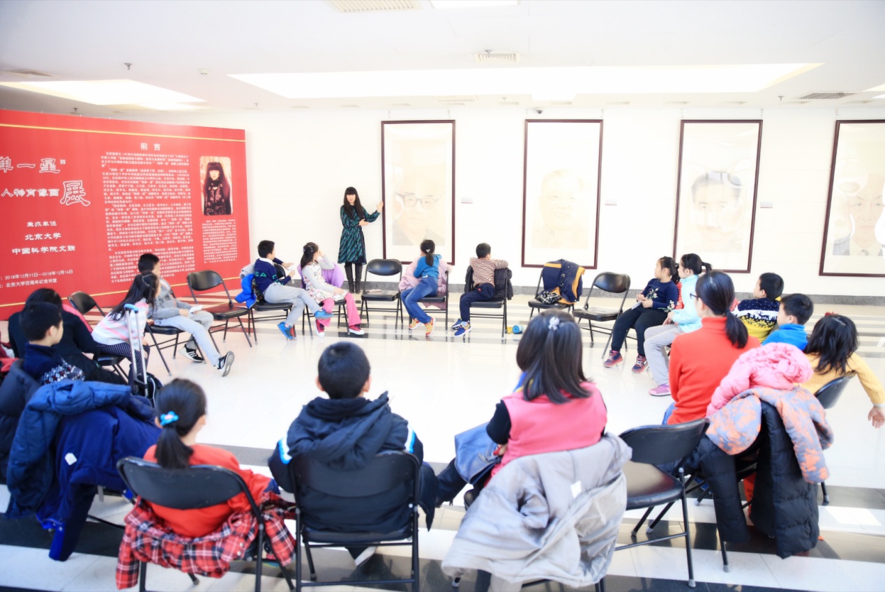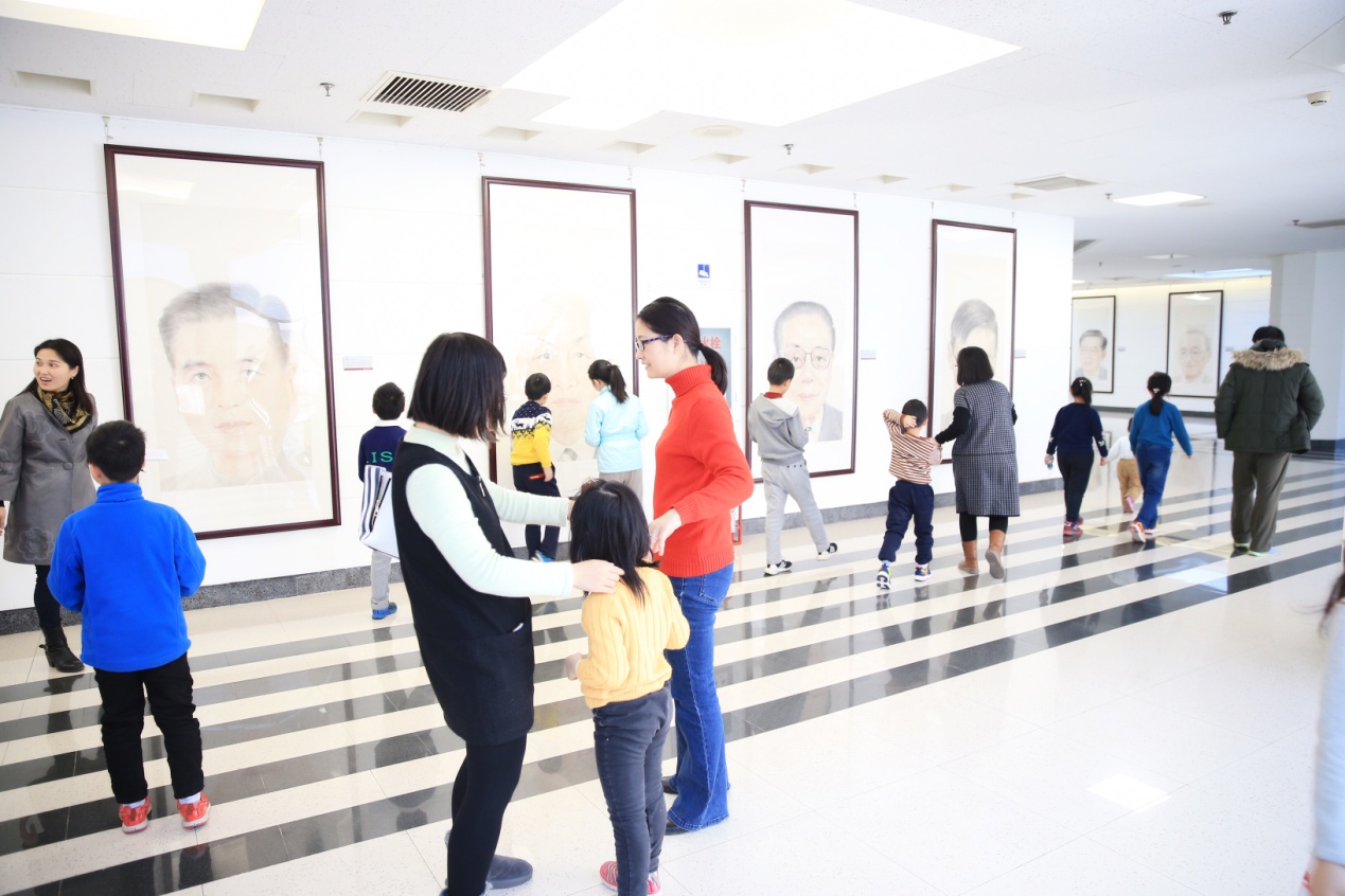 12月16日上午,小朋友们早早地来到百周年纪念讲堂。这个平日里充满了电影和演出的热闹场馆,挂上了一幅幅巨大的科学家画像,还真彷佛一座静谧的博物馆。这些画像既采用了水墨,又非常真实,画中的科学家们有的严肃认真,有的和蔼可亲,非常传神,孩子们纷纷猜测画家是怎么把它们画出来的。