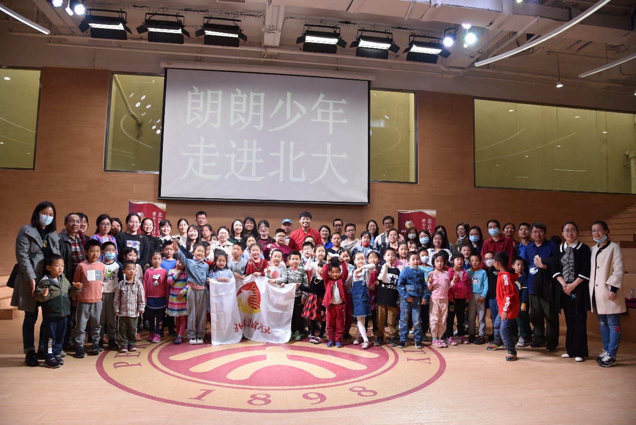 启蒙课很快就结束了,老师还让大家拿着旗帜拍照,家长站在后面,拍完照之后我还念了“朗朗少年,走进北大“这一行字。最后,宇东老师还让我们单独和他拍照。