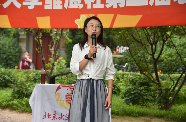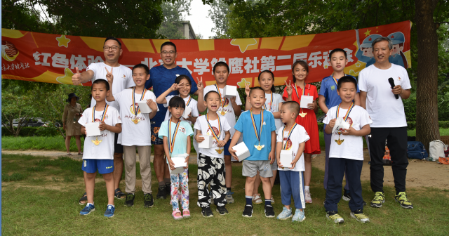 在本次比赛的颁奖之前,组委会先为前期参加 “100年,100天,100圈——奔跑吧,少年”完赛者颁发了奖章。这是雏鹰社为庆祝建党100周年举办的主题活动,共有13名小朋友用100天完成在北大五四操场跑步100圈,献礼建党100周年,他们年龄从幼儿园小班到六年级,有的小朋友风雨无阻天天坚持打卡,有的小朋友从起不来到天天来,大部分都是超额完成了任务。一枚枚带有金鹰翅膀的纪念奖章,鼓励这些小小少年用强健的体魄和坚持的意志完成任务,在党的光荣精神指引下传承红色理想,接续砥砺前行。