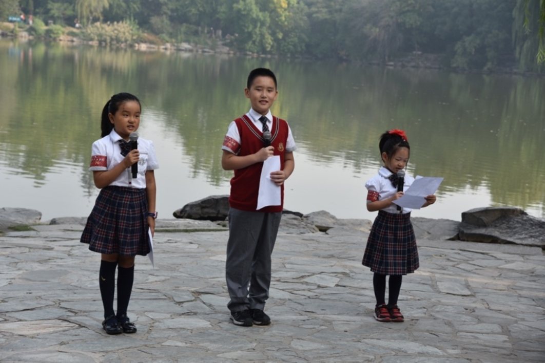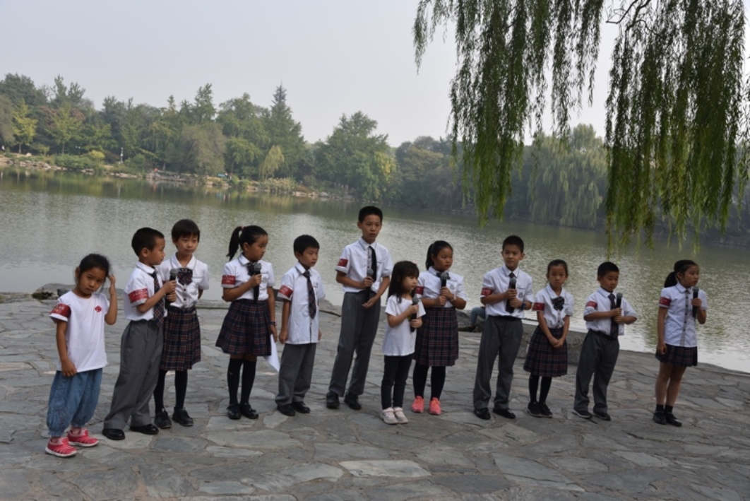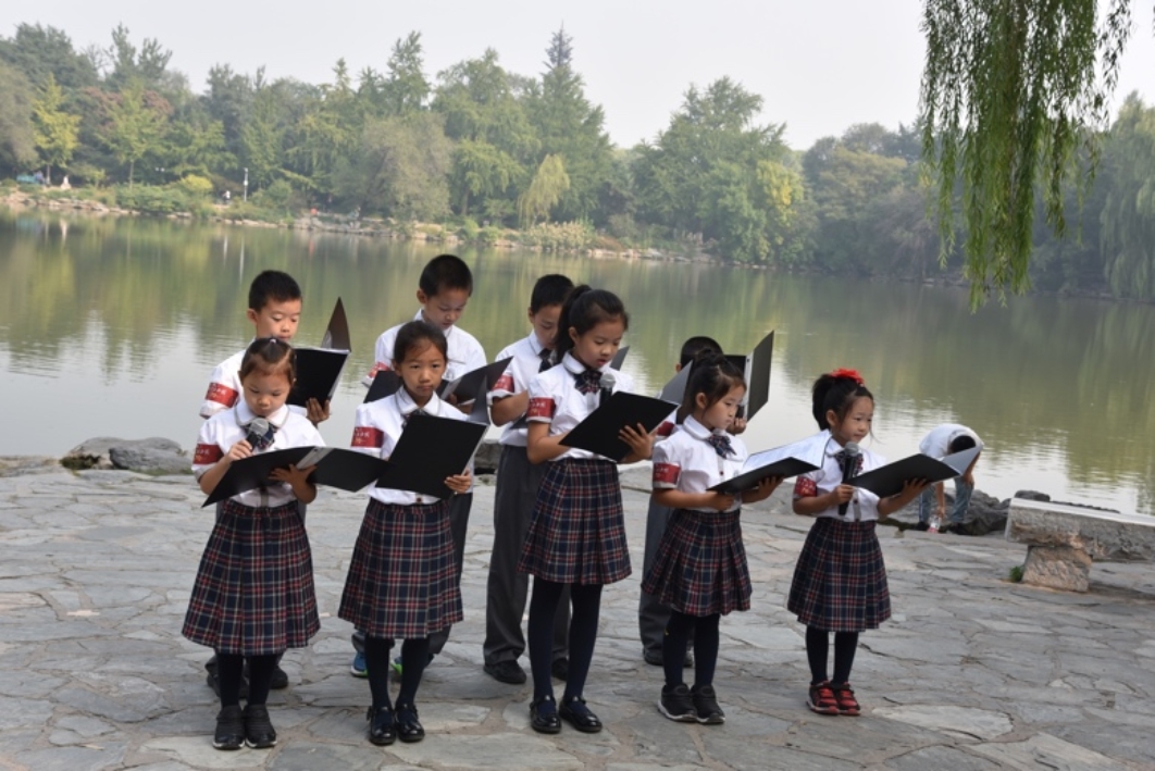 第一个登场的节目是歌曲合唱《我和我的祖国》,参演合唱的小会员们有的来自北大附小合唱团,有的刚刚学习唱歌。因为孩子们的水平不一,雏鹰社还特别请来一位专业的合唱老师为孩子们做了两次排练。当孩子们穿着整齐的礼仪校服唱响那暖心的旋律时,“我和我的祖国,一刻也不能分割”,那充满童真的、曲调优美的歌声飘荡在未名湖畔,让整个未名湖的秋景都焕发了生机,也增添了诗意,优美的旋律撞击着人们的心灵,一位老爷爷的眼里都泛起了泪花。