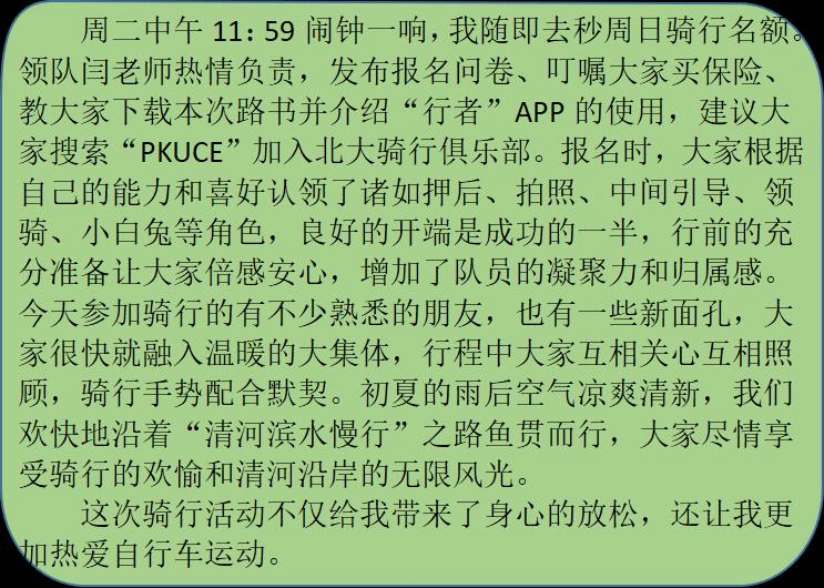 骑行路线:北大东门往北——丁字路口(清华西门)——十字路口(圆明园东门)清华附中上地学校往东——滨河路(到路头往北50米第二个小路口往东)(不要过桥)——清河南滨河路(清河河边)——过街天桥(横跨G6)——清河滨水慢行系统–—–温榆河公园北岸。