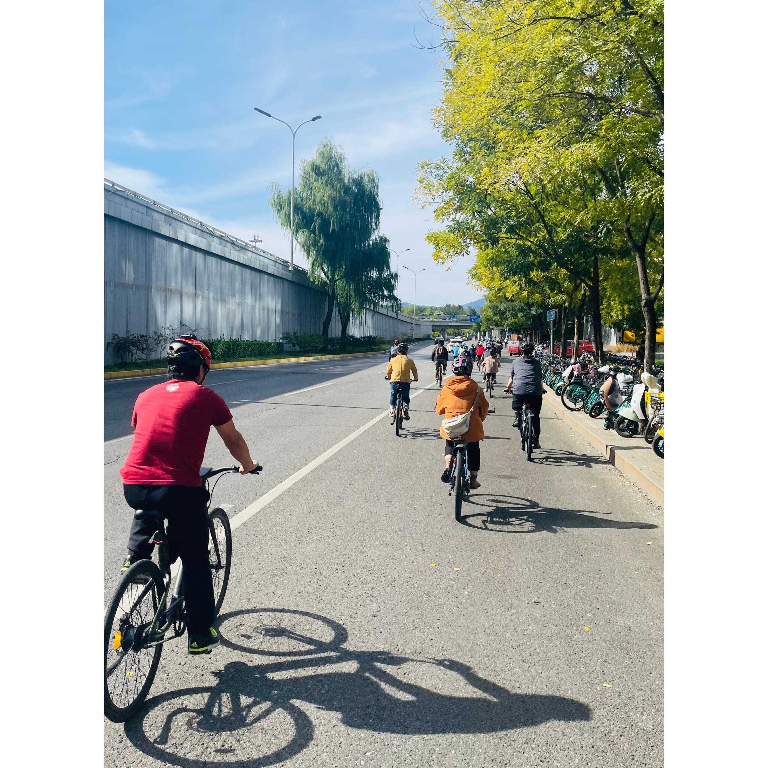 随后,骑行正式从燕园南门出发。24人的骑行团队,由闫丽萍老师领队,卢福泉老师押后,高桂芳、范爱文等老师负责巡骑,沿北四环西路辅路向西飞驰奔向颐和园南如意门码头。秋意正浓时节,沿途层林尽染,队员丝滑穿行于正午阳光与黄绿斑斓的树林中,耳畔阵阵风声拂过。