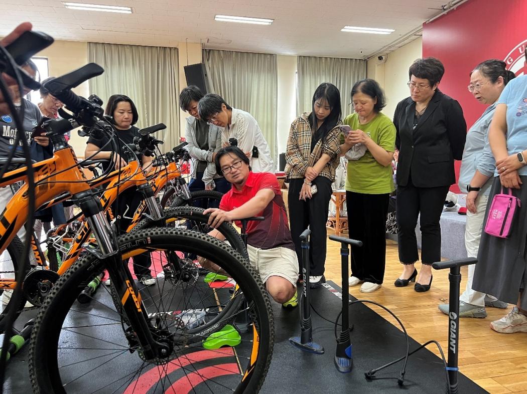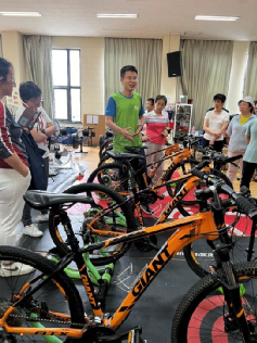 第一次培训活动开始了,赵前程和卢福泉老师为新学员进行变速车基本使用方法讲解。他们重点讲解了变速车的操作技巧,如何正确调节变速器、如何根据路况和坡度选择适合的档位;强调稳健的骑行姿势和适时的变速操作能够有效提高骑行效率和舒适度。