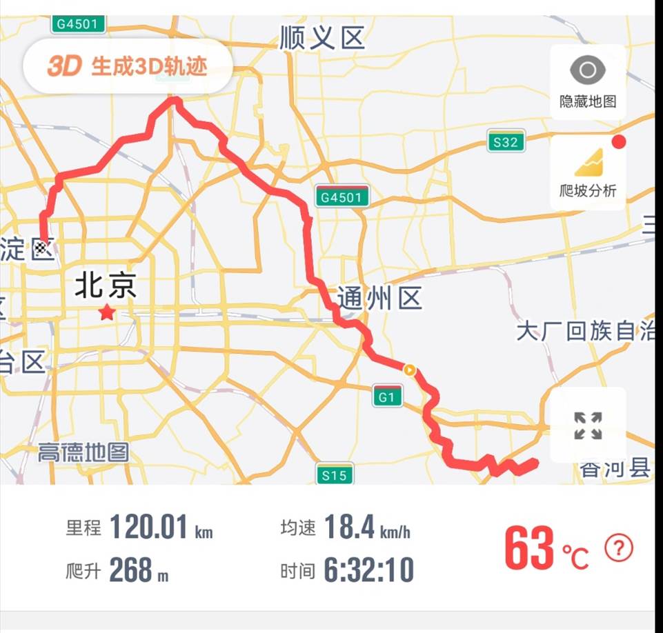 刚过京沈路口,整个滨河路向北封路维修,导致我们只能转向温榆河东面绿道,过温榆河桥,沿火沙路向西到来广营北路,才转到清河绿道上。这一绕路,增加了5公里路程,每个队员都超过了百公里,甚至达到120公里,打破了多人的个人骑行最远距离记录。