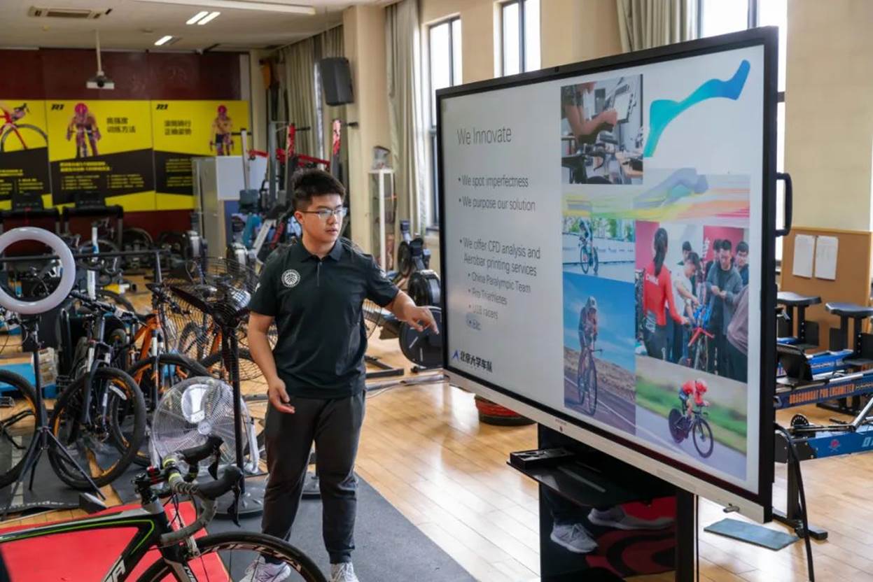 北大车协主席团成员陈东昊、李健宁、北大车队前队长米元博、区涵予、教工车协骨干孔涛老师,以及国际暑期课骑行老北京课程助教刘思哲依次介绍了协会的发展历史、日常工作以及重大活动,还特别介绍了他们领衔的各种创新项目和器材研发,如虚拟校园骑行、骑行安全教育、安全桌游开发、中小学骑行安全教育器材研发、竞技工程科学和信息科学应用等项目。乔·豪森体验了虚拟校园骑行和骑行安全系统测试后,认为该系统比ZWIFT更友好且更具教育意义。