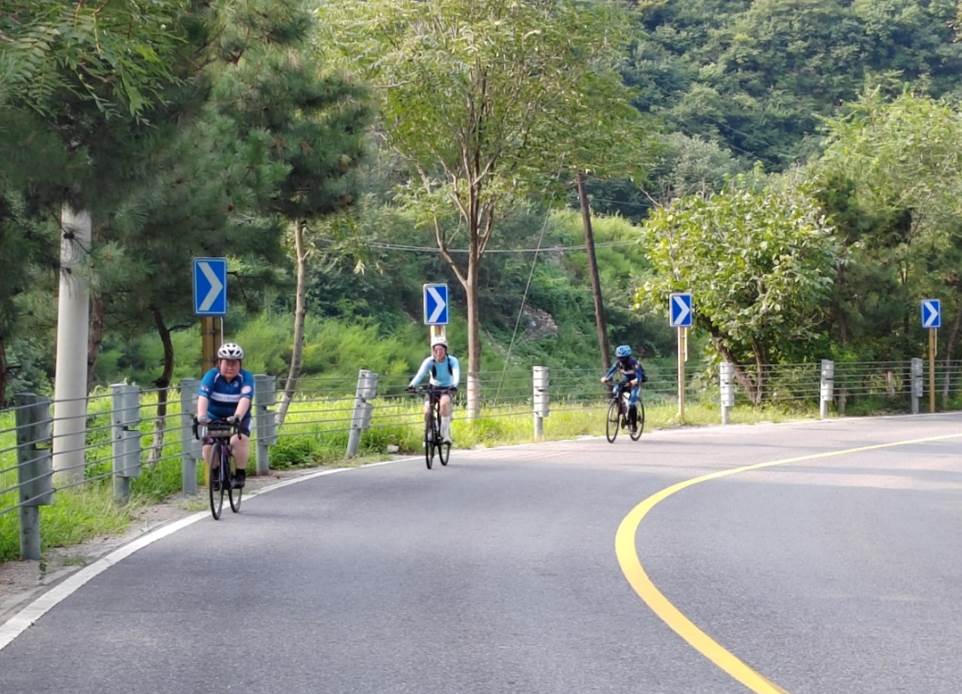 有爬坡就有放坡,宋庆生老师提醒各位老师放坡的速度别太快,慢着点,安全第一。因为爬坡训练得少,所以放坡大家也十分小心。但速度带来的是一种前所未有的快感,体会到驭风前行。风从耳边呼啸而过,仿佛是一曲无声的赞歌,歌颂着这一刻的释放与速度。妙峰山,用它特有的方式,给予了我们一场关于速度与自由的盛宴。
