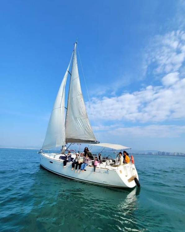 在三亚,在卢福泉的协调下,部分团员搭乘鸿洲国际游艇会的双动力帆船出海,对帆船运动有了直观的认识。