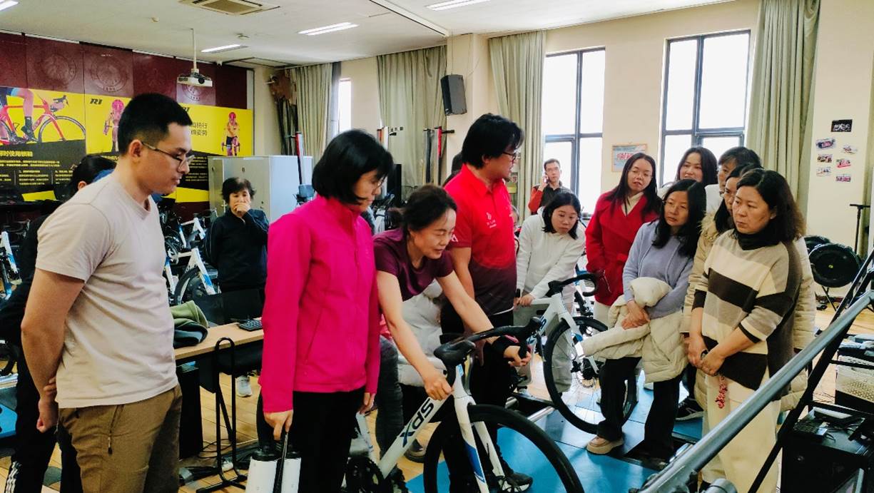 理事骨干分组指导新会员进行滚筒骑行台适应性训练: