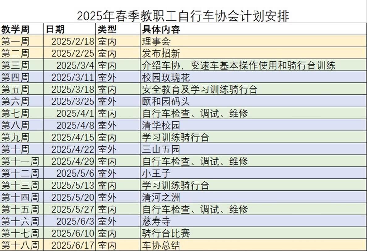 为了让会员们更好地安排时间参与活动,培训结束后,交流群里附上了本学期的训练计划。每周二中午 12:00 至 13:00 被设定为固定训练时间,若遇天气变化或学校活动冲突,训练时间将进行相应调整。此外,协会还将陆续开展一系列精彩纷呈的活动,如充满趣味的夜骑以及周末或假期的特色骑行活动,活动安排将提前发布。
