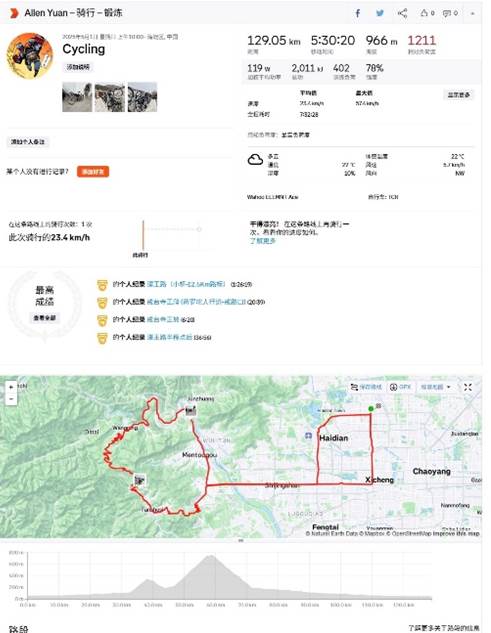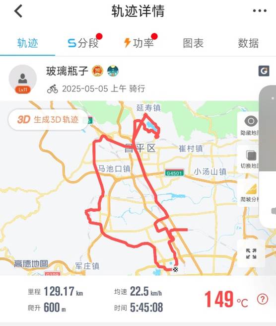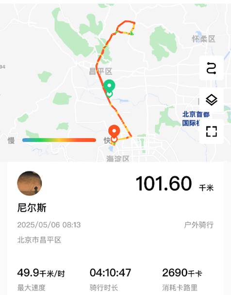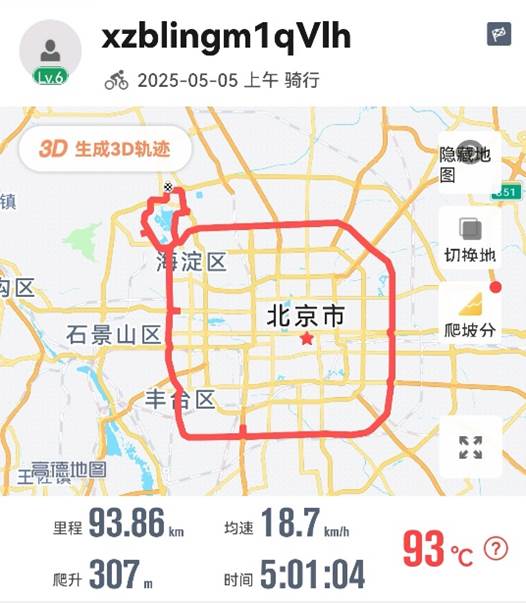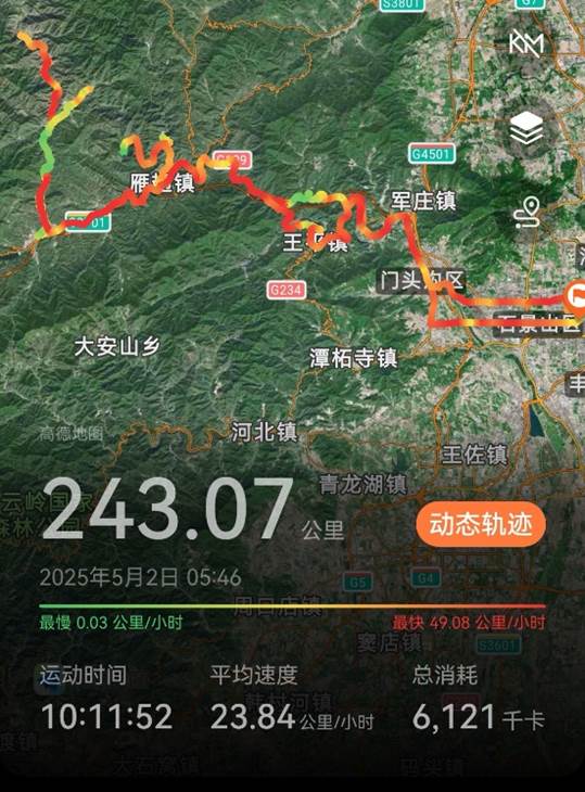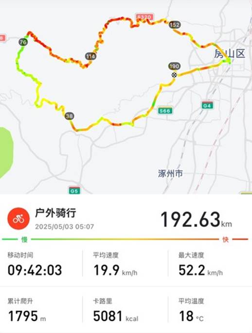 【43号-计算机学院-刘伟老师-大房山】,值此北大127周年华诞,有幸随教职工自行车协会骑行献礼。车轮滚滚,丈量祖国热土;清风徐徐,拂过赤诚之心。每一次蹬踏,都是对北大精神的致敬;每一滴汗水,都饱含对学校的深情。愿北大永铸辉煌,再谱华章!骑行线路起始于房山南大街,途径京周路、房易路、龙下路、云居寺路、周张路、涞宝路、京昆路、108国道复线、京昆路、阎河路、良坨路、北关西路、拱辰大街、良乡中路、良乡西路、月华大街、月华南大街、京周路、燕房路、房山东大街,最终回到房山南大街。 初夏骑行温馨提示以下几点: 一是出门早做好保暖工作,否则容易失温。(很冷,身体会僵) 二是装备要准备好,佩戴好。(要带骑行手套) 三是爬升量力而行,该歇就歇,补给要跟上。(准备充足的能量胶+盐丸+电解质水) 四是在山中骑行注意横风。(放坡的时候横风对于骑行影响很大,一个坡段可能有多个位置的来风) 五是注意野生动物袭击。(谨防野狗袭击,谨防蜜蜂钻进头盔里) 六是及时补充能量。(不然很容易低血糖,很危险) 七是不要随意跟不熟悉的人骑行。(骑行习惯不熟悉,容易发生事故)