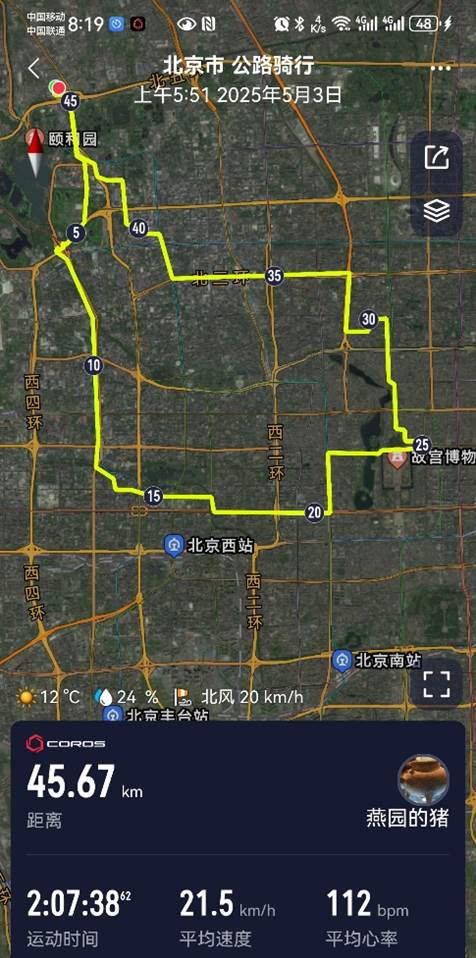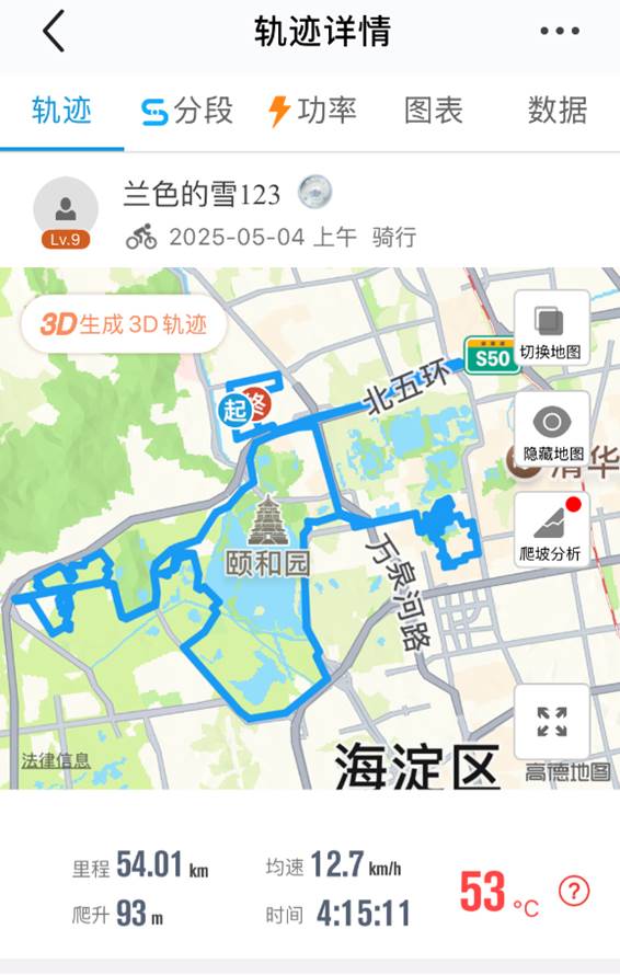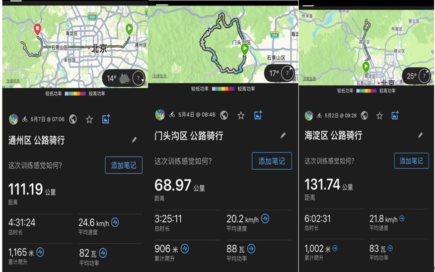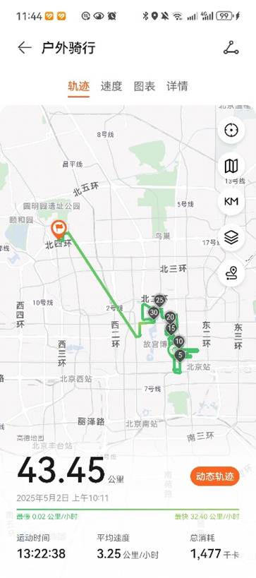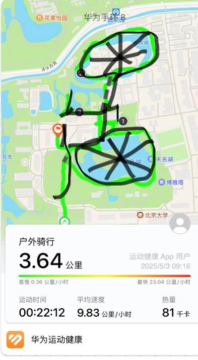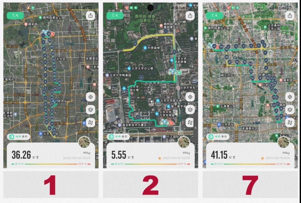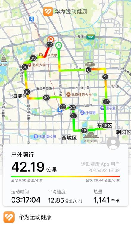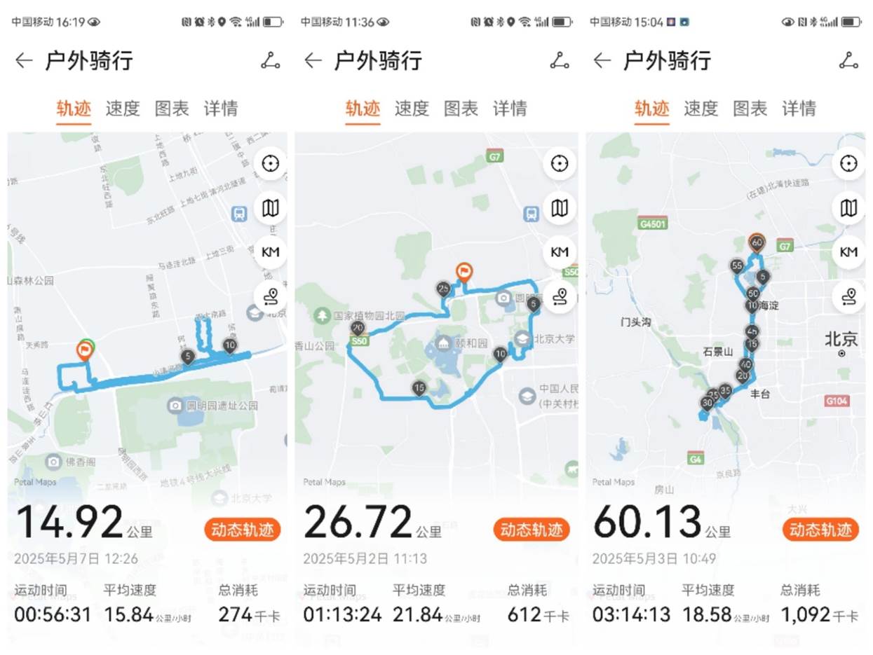 【127号-医学部-俞赤卉-三山五园】,七天期间断断续续骑行约280公里。5月1️号,成功骑行天津。94年10月曾与同学一起骑行过天津,30年后又成功骑行一次,老俞尚能骑!4号校内三山五园休闲转转凑够54公里 ㊗️北大生日快乐🎂