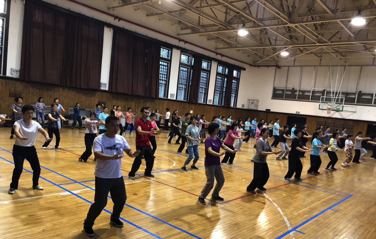 在王东敏、谢海江、陈跃天三位教练的指导和带领下,在场的教职工社员进行了实用又有趣的热身活动,随后复习了上学期所学的陈式太极八式。老社员们精神饱满,打出了一套规范、连贯、协调的太极动作。而新社员虽然尚未系统学习,但在教练的带领下,也能跟上身边老社员的动作,依葫芦画瓢,一招一式也有板有眼。