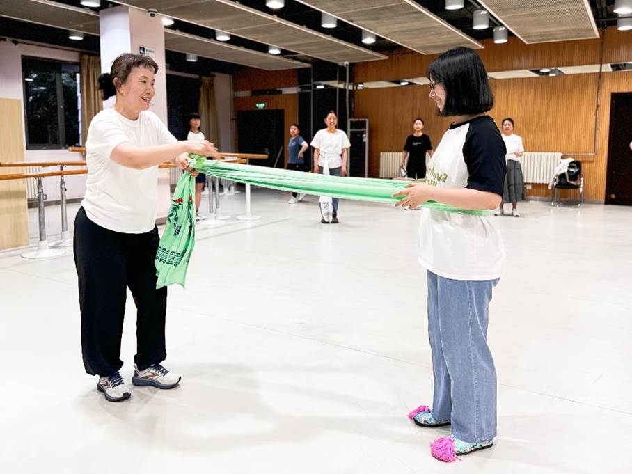 2024年6月5日周三晚,在北京大学工会和北京大学昆曲传承与研究中心的支持下,教工昆曲古琴协会为备战第十七届“良辰美景·恭王府非遗演出季”高校版《牡丹亭》专场,在邱德拔体育馆延请国家一级演员、北方昆曲剧院优秀六旦演员王瑾老师为大家传授昆曲基本功训练要领,重点学习了掐腰踏步、云手山膀、顺风旗和走圆场等内容。协会成员与学生京昆社社员共计十余人来到现场学习和训练,在一招一式中体会昆曲艺术“口传心授”的教学精髓。
