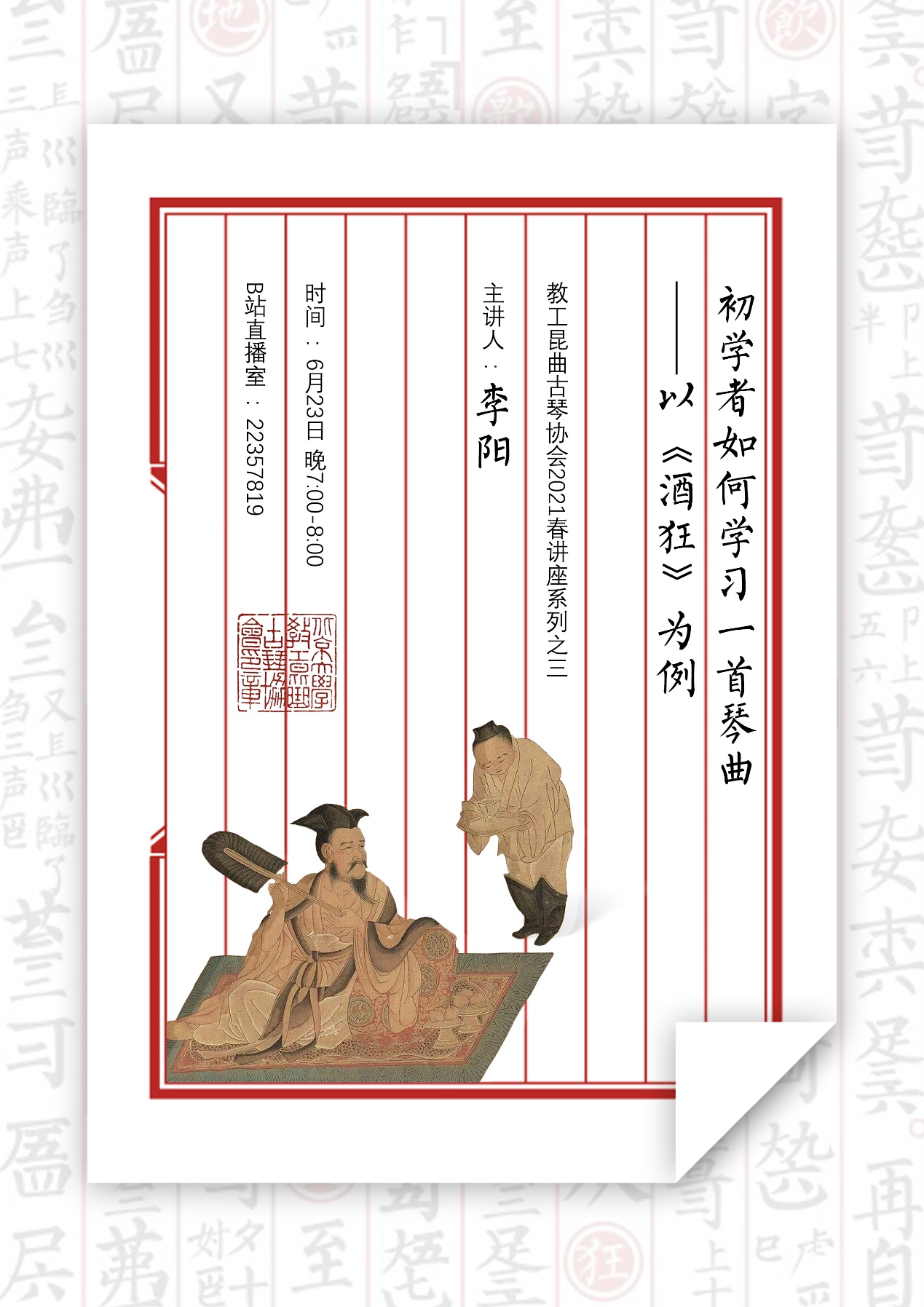 6月23日,教工昆古协春季系列讲座进行第三场,特邀协会副秘书长、传习部部长李阳老师主讲“初学者如何学习一首琴曲——以《酒狂》为例”。讲座主要针对已经学完《酒狂》的会员老师们,探讨如何在会弹的基础上继续精进,完成一首动听的琴曲。