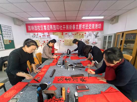 下午,燕园印社成员们奔赴圆明园校区。圆明园校区为丰富业余文化生化,专门开辟了书画室、活动室。虽天寒而情暖,现场气氛,热烈非常。老师们怀热忱之心,抒新春之愿。以笔寄情,用墨送福。“灵蛇出岫迎佳气,瑞霭盈庭报福音”,春联寓意,尽蕴吉祥。印社成员与北大圆明园校区的老师和工作人共浸墨香之境,同感传统文化之深邃。笑语欢声,和墨香而四溢;情浓意厚,伴年味以氤氲。不同字体、不同风格的书法作品相互交融,北大之精神:思想自由,兼容并包,于此次活动之中,尽显无遗。