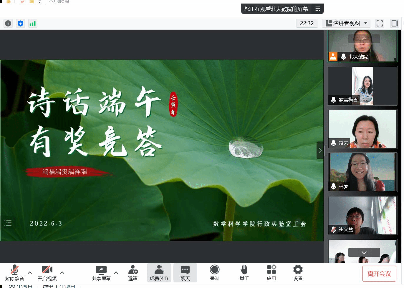2022年6月3日,为响应国家号召,不扎推、不聚集,数学学院行政工会开展“诗话端午”线上抢答主题活动,学院行政工会会员们一起“云”上过端午。
