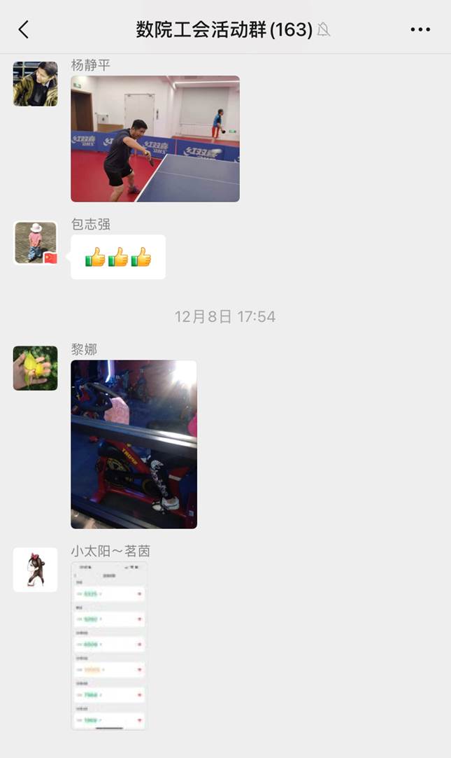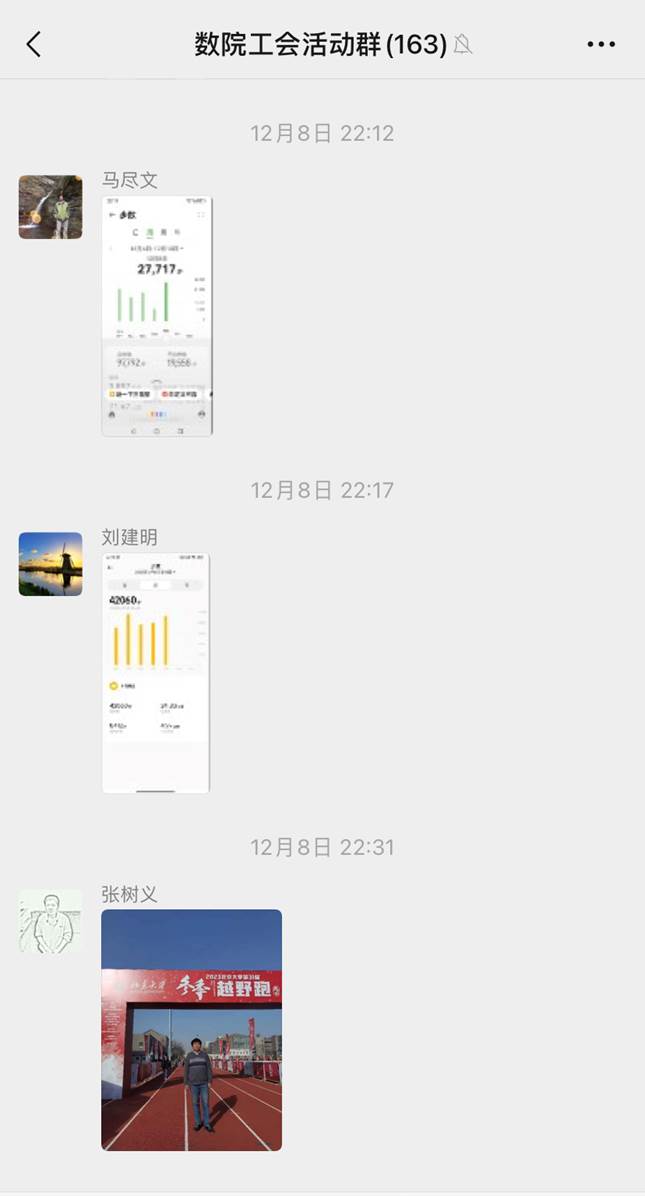 生命不息,运动不止。为了激发广大教职工的运动热情,促使大家树立“健康第一”的理念,数学科学学院工会在2023年的最后一个月例行开展运动月线上打卡活动。外出活动、每日健步走、燃烧卡路里的奔跑、每周羽毛球的比拼、每日乒乓球的切磋、优雅的瑜伽修行……这些都是学院工会会员的运动记录。学院工会鼓励大家积极投入“运动月”打卡活动,与大家分享运动的快乐与成果。无论是户外跑步、室内健身,还是团队运动,每一次记录都是对自己健康的一次投资。本次活动得到了学院100多名工会会员的踊跃参与,他们将运动的照片或者视频或者健身APP打卡等形式记录分享到“数院工会活动群”或者发送到工会邮箱。