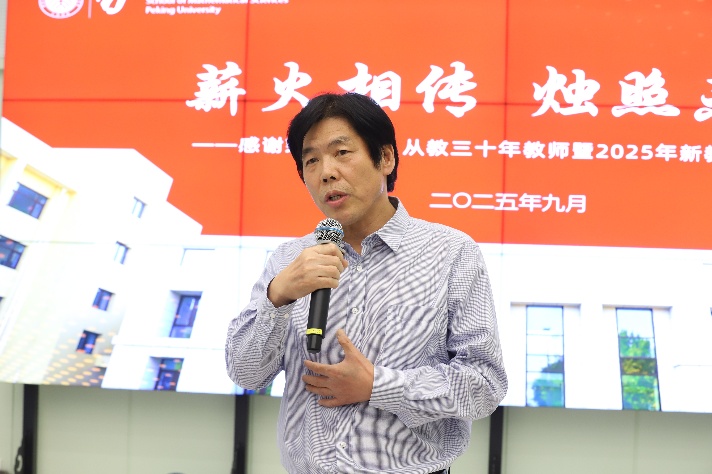 随后,几位教师代表分享了自己的感言。房祥忠老师回顾了自己在北大几十年的工作与生活,他表示,能够长期扎根在这片学术沃土,得益于老一辈教师的关爱与帮助。在科研和教学的道路上,他不仅收获了成长,更收获了与同事们之间的深厚情谊。他衷心感谢前辈教师们的悉心培养,感谢学院长期以来的支持和关怀,也感谢同事们一路以来的协助与鼓励。最后,他深情祝愿学院未来发展越来越好,祝愿青年教师们在各自的学术与事业道路上取得更加丰硕的成果。