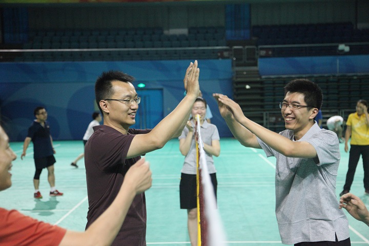 数学一队的新生力量张磊教授首次参加毽球比赛,就充分发挥了自己身为学院头号羽毛球手在球场上积累的经验优势。他在一队的多场比赛中担当重任,并且凭借不凡的身手、敏捷的移动和灵巧的球路连连得分。一队一度取得四连胜。但在决定小组头名的关键一役中,数学一队以1:2惜败于地空一队,最终取得五胜一负的成绩,位居D组第二,连续第四年杀入复赛十六强。
