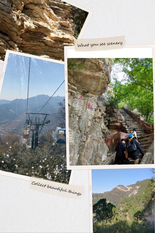 北京的深秋五彩斑斓,秋日登山,天高气爽,空气宜人。这里拥有著名的十二峰,其中以天柱峰为奇,坐落在上方山中央,登上山顶可览上方山全景。而登上方山,可不是一件容易的事,要登上由262级绝壁石阶组成的云梯才可到达。行走在山间,古寺、古塔、古道相互掩映,历史的痕迹便在石缝与林木之间垒砌着。云梯往上就到了龙王庙,这里有一处泉眼,我们到的时候有厚木板盖着,打开看了一眼,水很清澈,但是看不到泉的眼,不知是雨水还是泉水。再往上是兜率寺,这附近有小卖部,可以适当补给。这里有一颗槐树王,距今1500多年,还枝繁叶茂,看着王朝兴替、时代变迁。在上方山,赏的是风景,品的是心声。