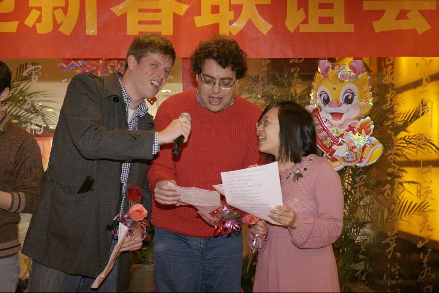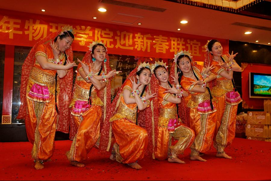 今年联谊会的节目,都是工会会员们利用业余时间精心准备的。随着悦耳的印度音乐响起,六位身穿金色罗裙、头披轻纱的美女赤足含羞袅娜入场,表演印度舞蹈《过年了》。脚铃声声,青春洋溢,明眸、眉梢的挑动,谐妙入神,举手投足间赢得阵阵喝彩。