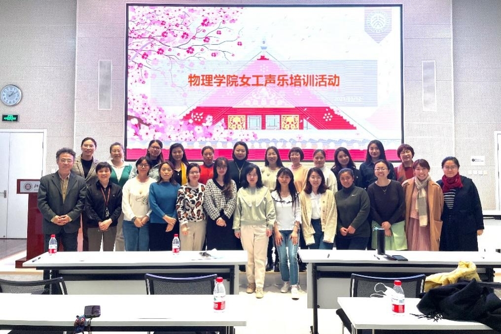 2021年3月12日,物理学院工会在学院西楼思源报告厅开展了女教职工声乐基础培训系列活动的第一期。该系列活动旨在丰富女教职工艺术生活,计划四期培训活动后将采集女教职工演唱音频制作成完整歌曲,做为建党百年及物理学院建院二十周年的献礼。此次活动邀请到中央歌剧院女高音、国家二级演员高超为老师们进行声乐基础培训和演唱练习,练习歌曲为《灯火里的中国》。