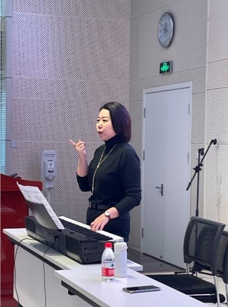 高超老师首先带领老师们进行了基础的发声练习,同时强调了气息在唱歌中的重要性。看似简单的“ b\p\k ”3个气音在经过组合和加速下变得有点“烫嘴”,但在反复练习下老师们都找到了感觉。其后高老师弹奏上行音阶和下行音阶,指导老师们用“呜”“嗡”“汪”等声音、连音和跳音继续练习气息和发声,同时也是进行音准的练习。期间高老师对部分老师的音准、高音、口腔开合、发音嘴型等各方面细节进行了指导。