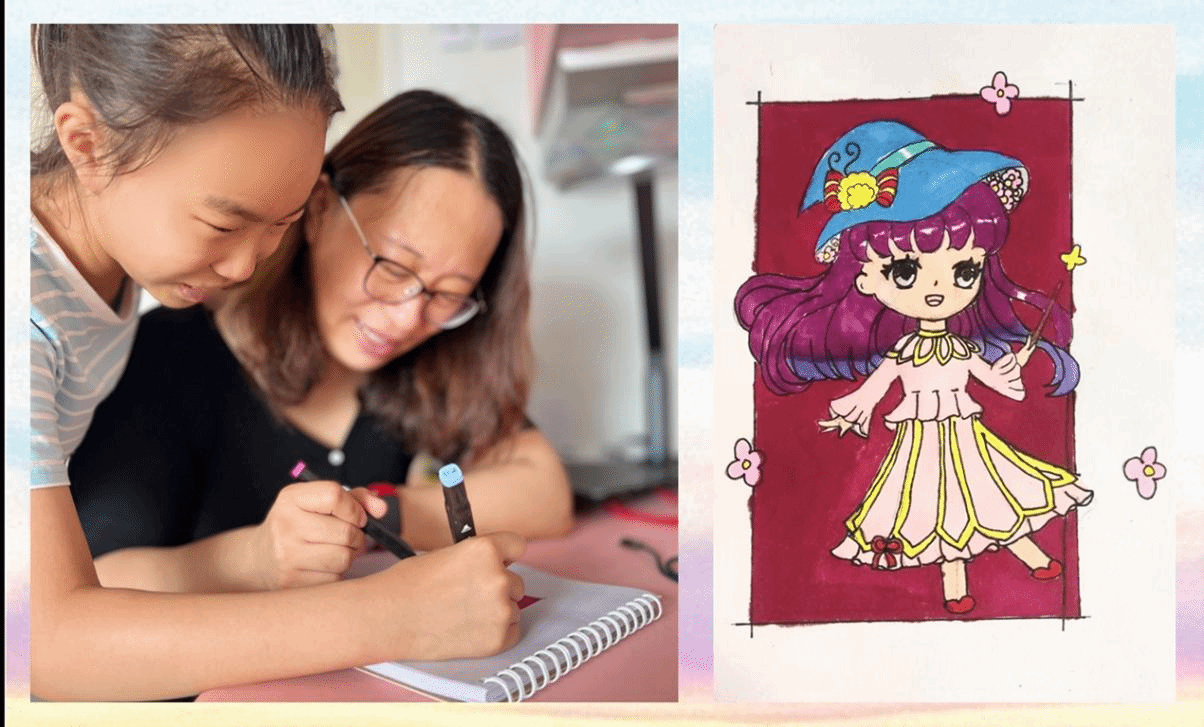 郑宇菲:在这次“六一亲子打卡”活动中, 我和妈妈一起画了一幅名叫《小小魔法师》 的画。 我从魔法师的头开始画,妈妈在一旁指导。经过几个小时的努力,我和妈妈终于完成了这幅画。 在这次活动中,我懂得了如何与他人合作。