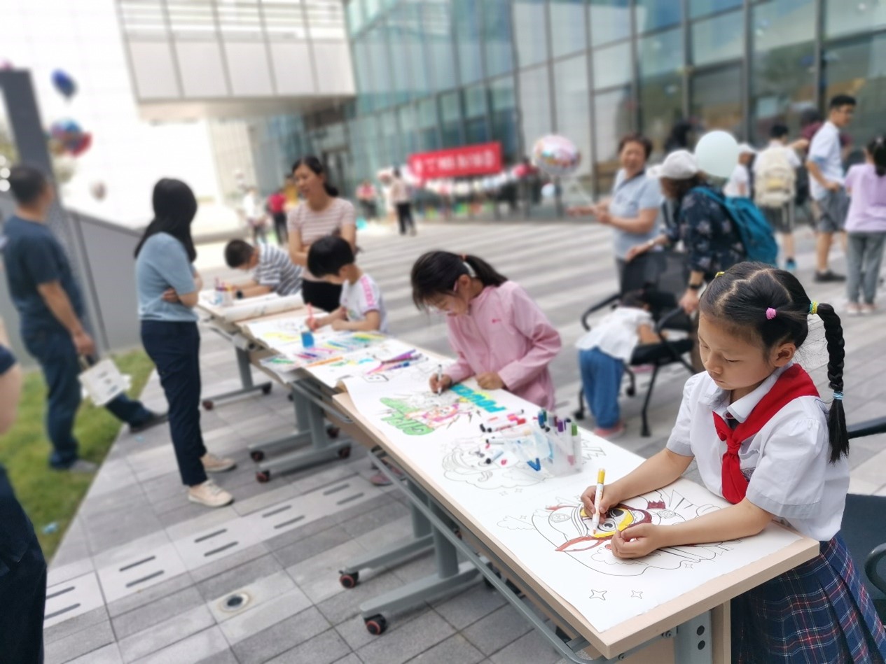 工会的老师们准备了多个小游戏:有卡通涂鸦、手工串珠、搬砖过河,还有在小朋友们看来有些“古老“但却满载着大朋友们童年回忆的套圈和跳房子。每参与一种活动,小朋友们可以得到一枚勋章贴纸。集齐五张贴纸就算完成任务,可以兑换任务奖励。