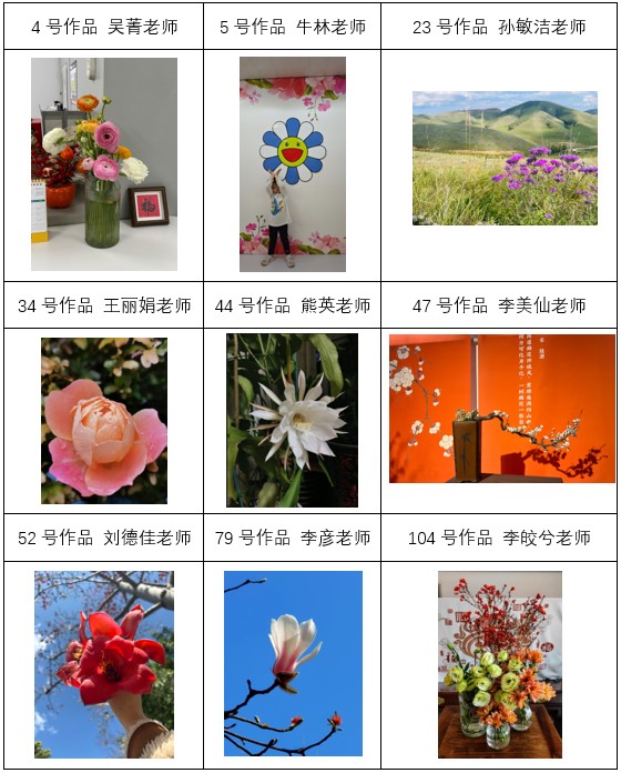 参与本次活动的老师们通过问卷形式提交了自己拍摄的与“花儿”相关的摄影作品,作品题材多样,有自然生长的各种鲜花,如桃花、梅花、杏花、荷花等等,也有老师们精心布置的家庭插花,还有手工制作的花朵摆件以及孩子们的绘画作品。