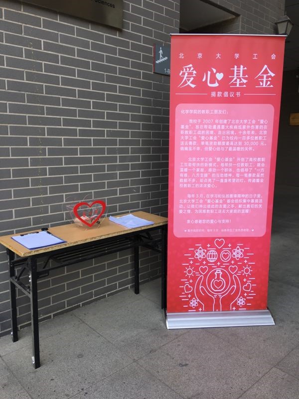 北京大学工会“爱心基金”是学校工会根据中共中央和中华全国总工会的有关文件于2007年设立,旨在推动“送温暖”活动,倡导互助精神,使受惠教职工感受到学校大家庭的关怀和温暖。爱心基金来源于校内外单位赞助、个人捐款及其它合法收入,其中校内单位及教职工个人的捐赠占主要份额。在校工会爱心基金管理委员会的精心组织和认真管理下,基金成立12年来,共计收到捐赠款约420万元,支出善款270余万元,惠及164位教职工及其家属。化学学院工会多年来一直在校工会的领导下积极开展爱心基金的募集,过去两年共计有203人次的化学院师生参与捐款约4万余元。基金成立以来,化学学院有多位教职工因病或突发事故获爱心基金资助,院工会还为部分离世教职工的家属申请了慰问金。虽然每笔善款数额不大,但传递着全校教职工的浓浓关爱之心,使受助人感受到了学校大家庭的温暖。本年度,根据校工会“爱心永在,关爱无限”的倡议和安排,化学学院工会于3月26-28日在学院内组织了爱心基金的年度募捐活动,得到了院内教职员工的积极响应。尽管募捐首日遭遇大风,撕扯了募捐宣传倡议书,但这没有影响人们奉献爱心的行动。最终共计83位教职工参与了捐款活动,募集资金13170元。“赠人玫瑰,手有余香”,衷心感谢这些奉献爱心的教职工。(名单如下,按姓氏顺序排列)