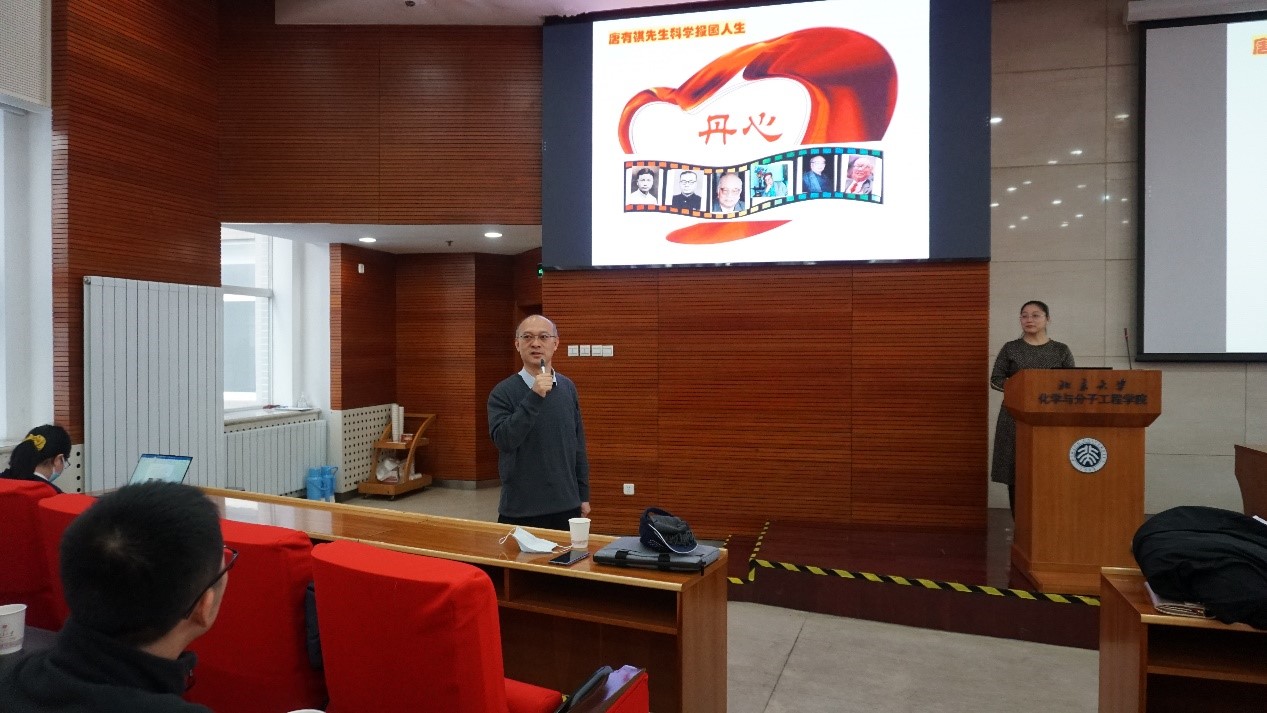 接下来,阎云老师介绍了唐有祺先生归国后为我国科学事业和祖国建设的贡献。唐先生坚持在严峻的条件下开启科学研究,为新中国培养出一大批化学人才,他不仅在晶体化学方向做出卓越贡献,更是大力倡导化学生物学、分子工程学等面向国际前沿的学术方向。唐先生更是从大局出发,为中国国际学术交流工作创造更好的条件,当国家科研工作受到社会主义市场经济冲击时,还锲而不舍地推动“跨世纪人才工程”的实施,为建设稳定的科技队伍布局谋篇,开创了我国在科学在教育领域设立优秀青年人才计划的先河。